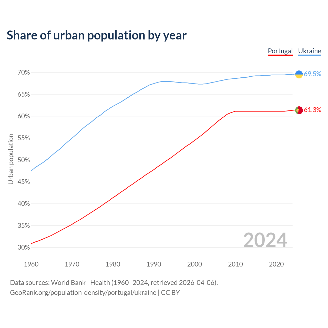 From 2004 to 2024, the share of urban population changed from 57.4% to 61.3% in Portugal and from 67.6% to 69.5% in Ukraine.