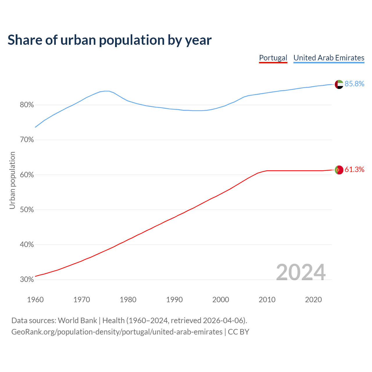 From 2004 to 2024, the share of urban population changed from 57.4% to 61.3% in Portugal and from 81.5% to 85.8% in the United Arab Emirates.