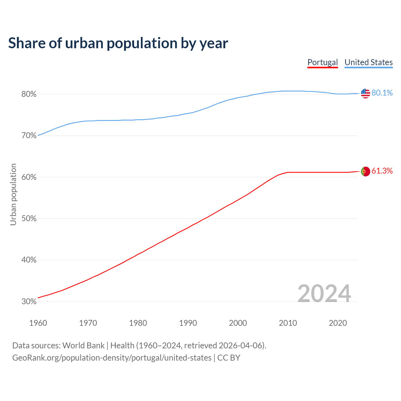 From 2004 to 2024, the share of urban population changed from 57.4% to 61.3% in Portugal and from 80% to 80.1% in the United States.