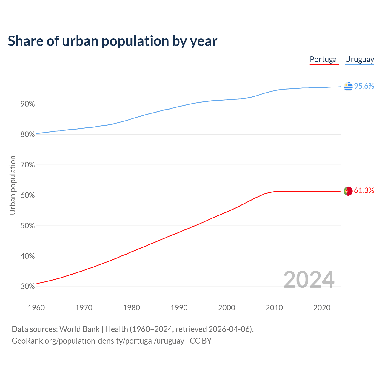 From 2004 to 2024, the share of urban population changed from 57.4% to 61.3% in Portugal and from 91.8% to 95.6% in Uruguay.