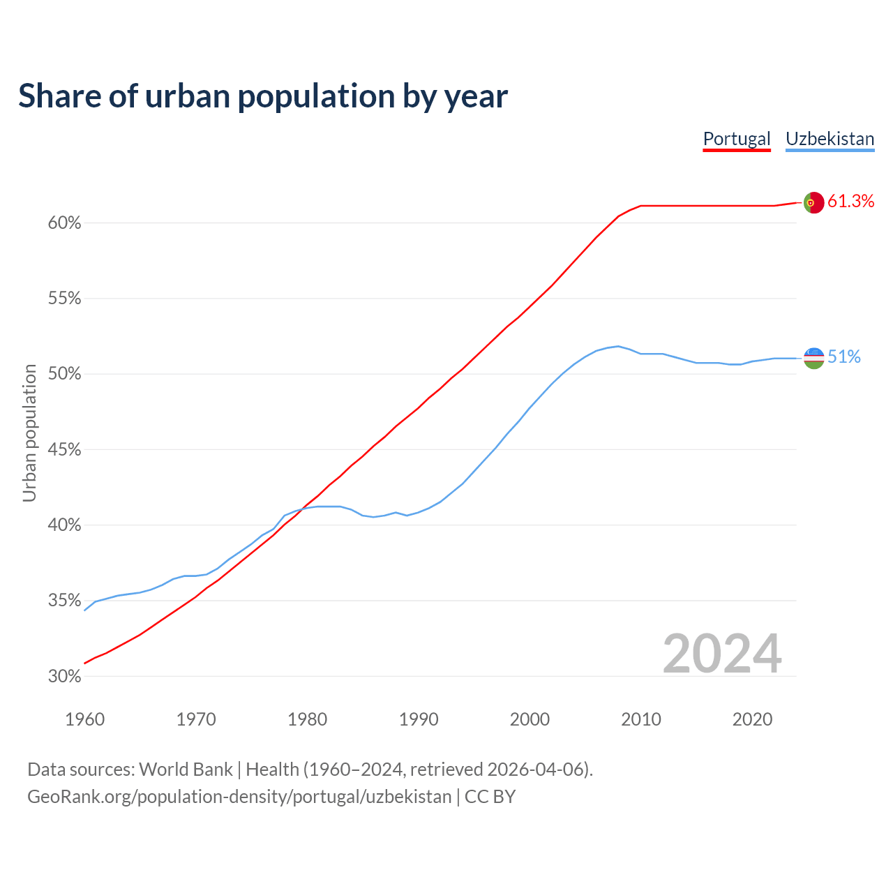 From 2004 to 2024, the share of urban population changed from 57.4% to 61.3% in Portugal and from 50.6% to 51% in Uzbekistan.