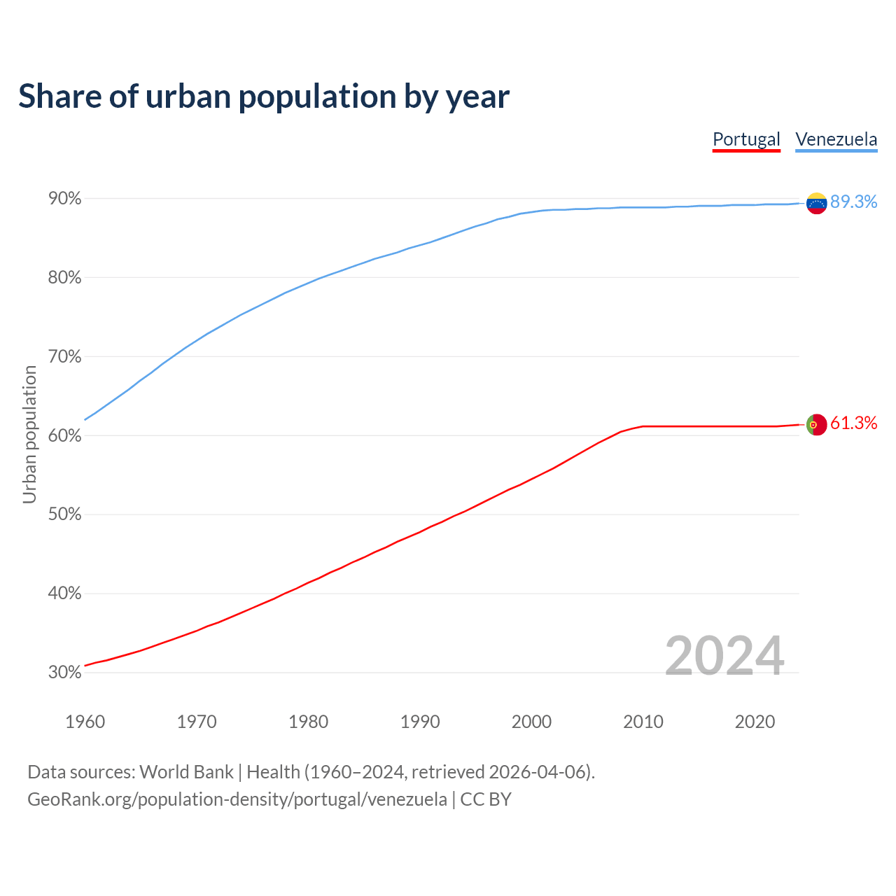 From 2004 to 2024, the share of urban population changed from 57.4% to 61.3% in Portugal and from 88.6% to 89.3% in Venezuela.