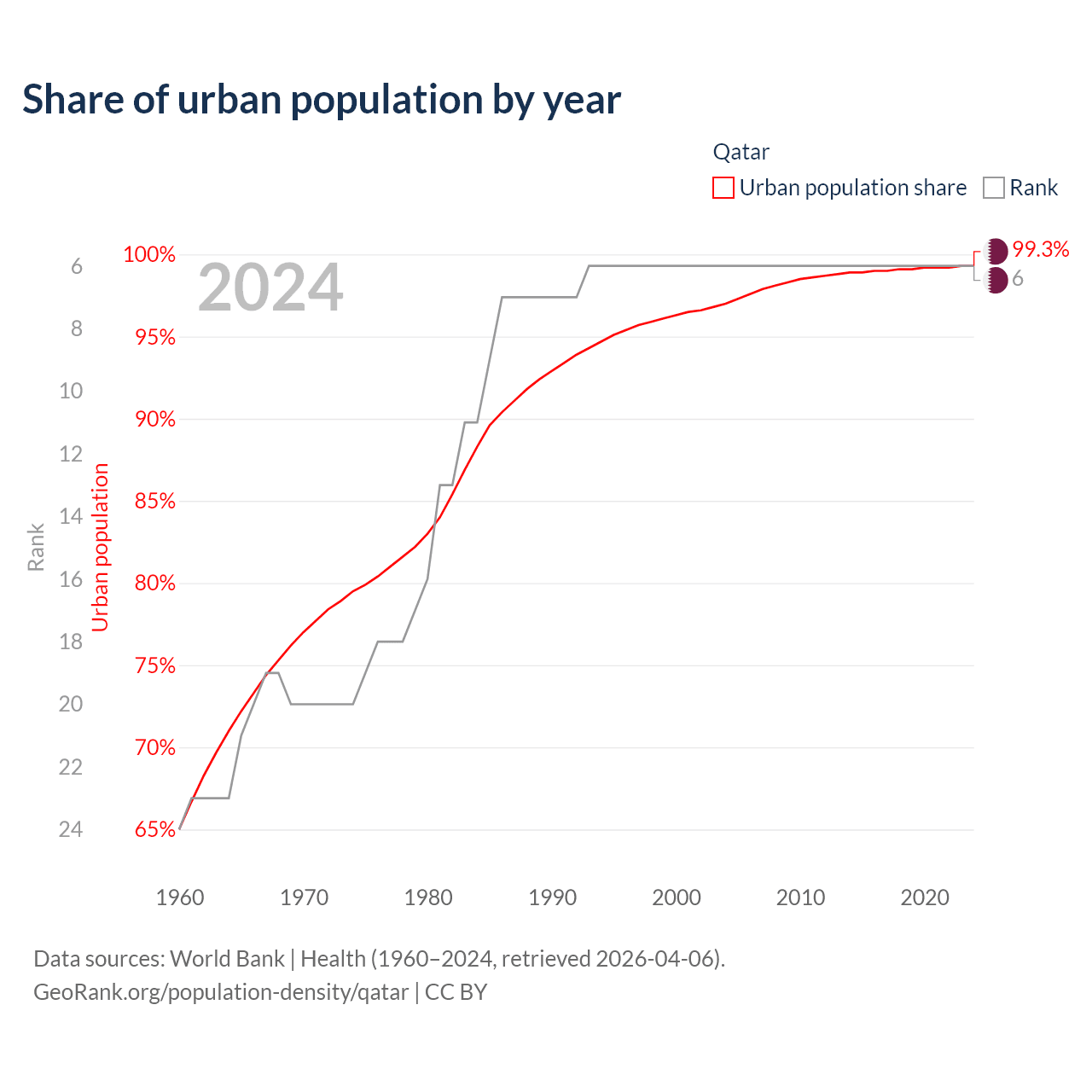 This chart shows the share of urban population in Qatar from 1960 to 2024: 65% lived in urban areas in 1960, 96.3% in 2000, and 99.3% in 2024.