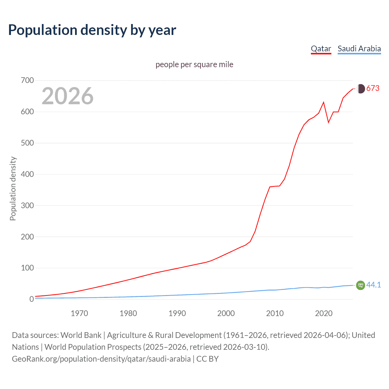 From 2006 to 2026, population density in Qatar increased by 210.1%, compared to a 70.4% growth in Saudi Arabia.
