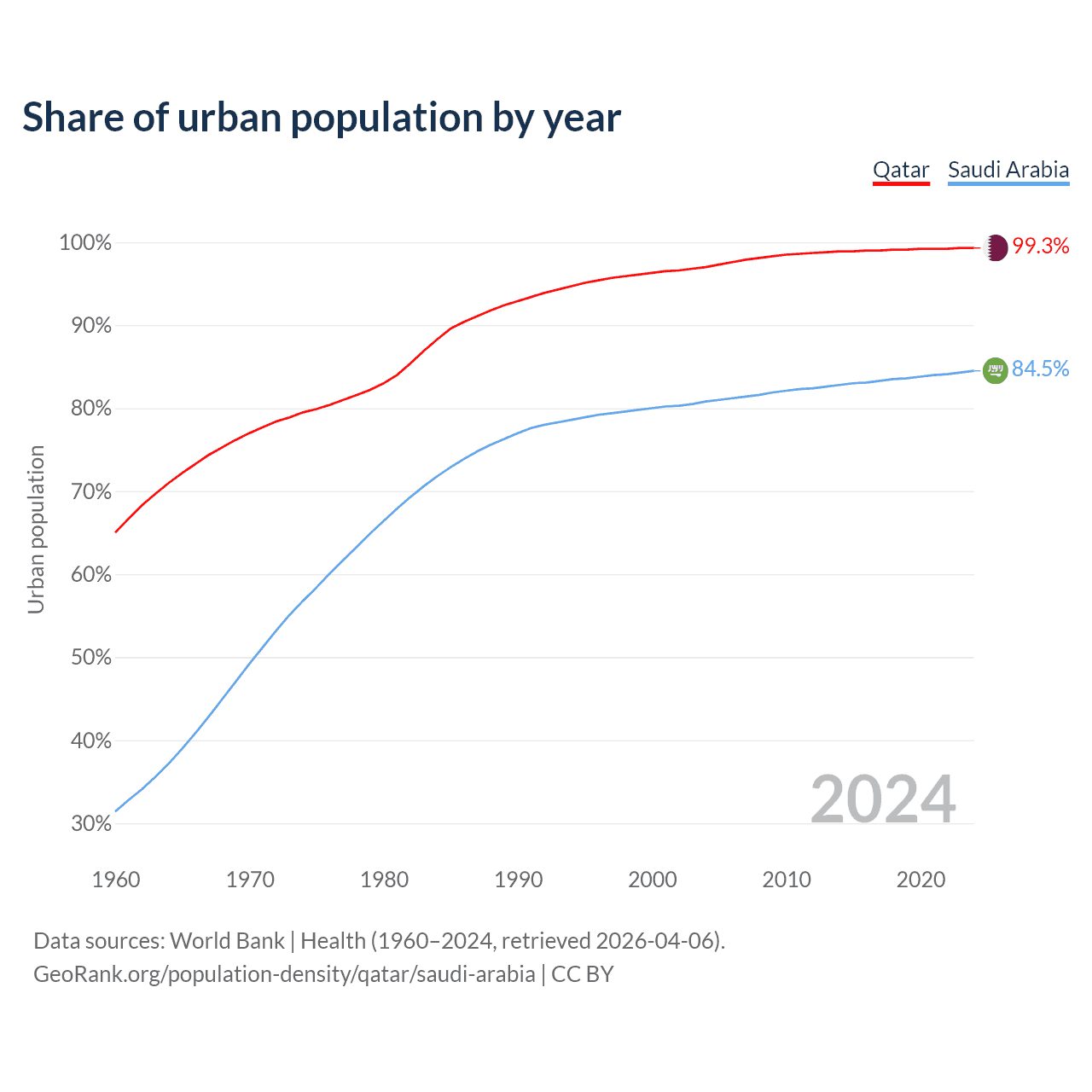 From 2004 to 2024, the share of urban population changed from 97% to 99.3% in Qatar and from 80.8% to 84.5% in Saudi Arabia.