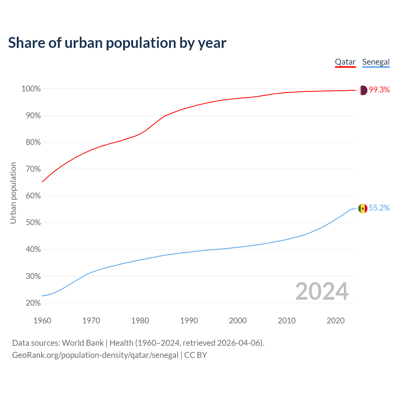 From 2004 to 2024, the share of urban population changed from 97% to 99.3% in Qatar and from 41.6% to 55.2% in Senegal.