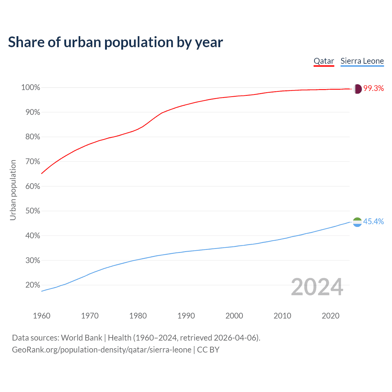 From 2004 to 2024, the share of urban population changed from 97% to 99.3% in Qatar and from 36.5% to 45.4% in Sierra Leone.