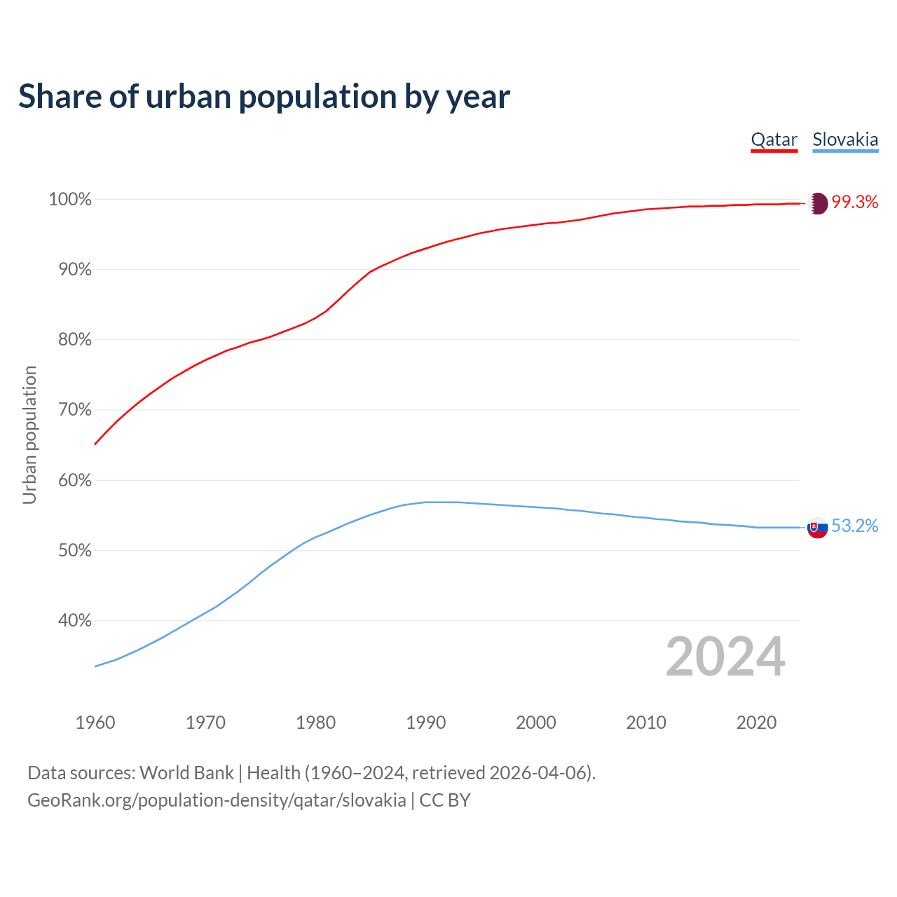 From 2004 to 2024, the share of urban population changed from 97% to 99.3% in Qatar and from 55.6% to 53.2% in Slovakia.
