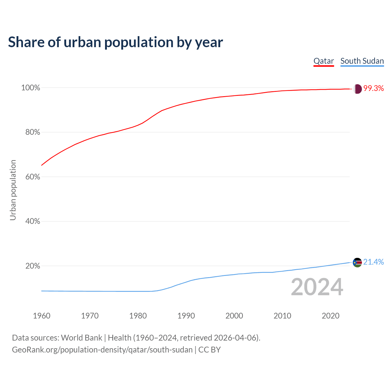 From 2004 to 2024, the share of urban population changed from 97% to 99.3% in Qatar and from 16.8% to 21.4% in South Sudan.