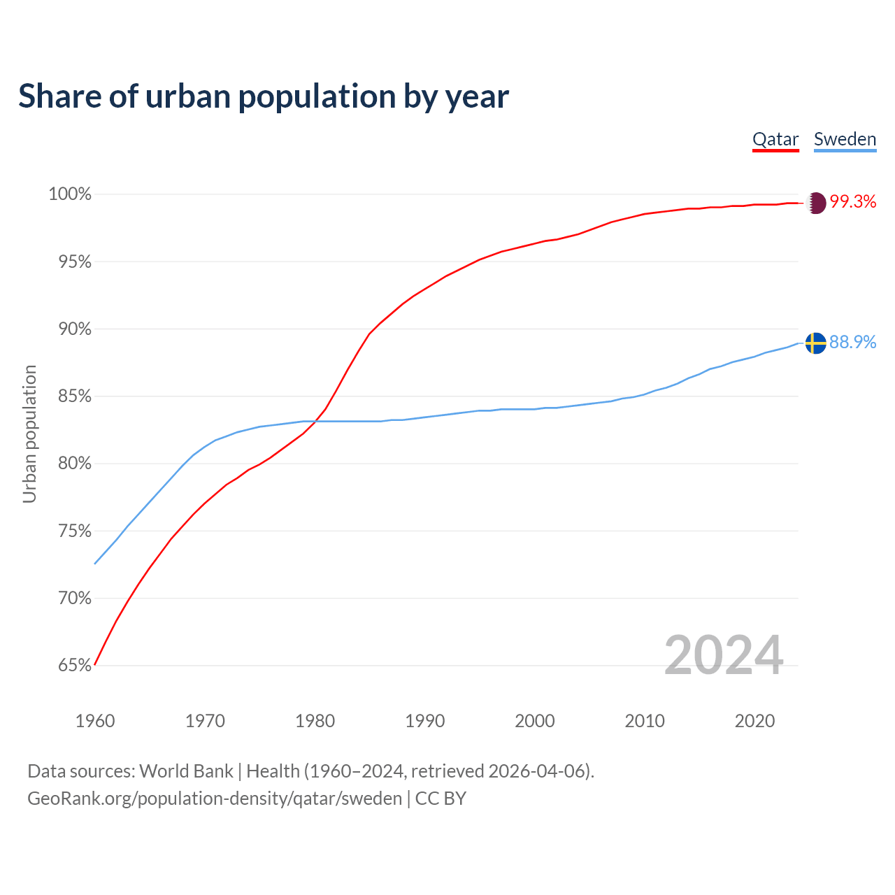 From 2004 to 2024, the share of urban population changed from 97% to 99.3% in Qatar and from 84.3% to 88.9% in Sweden.