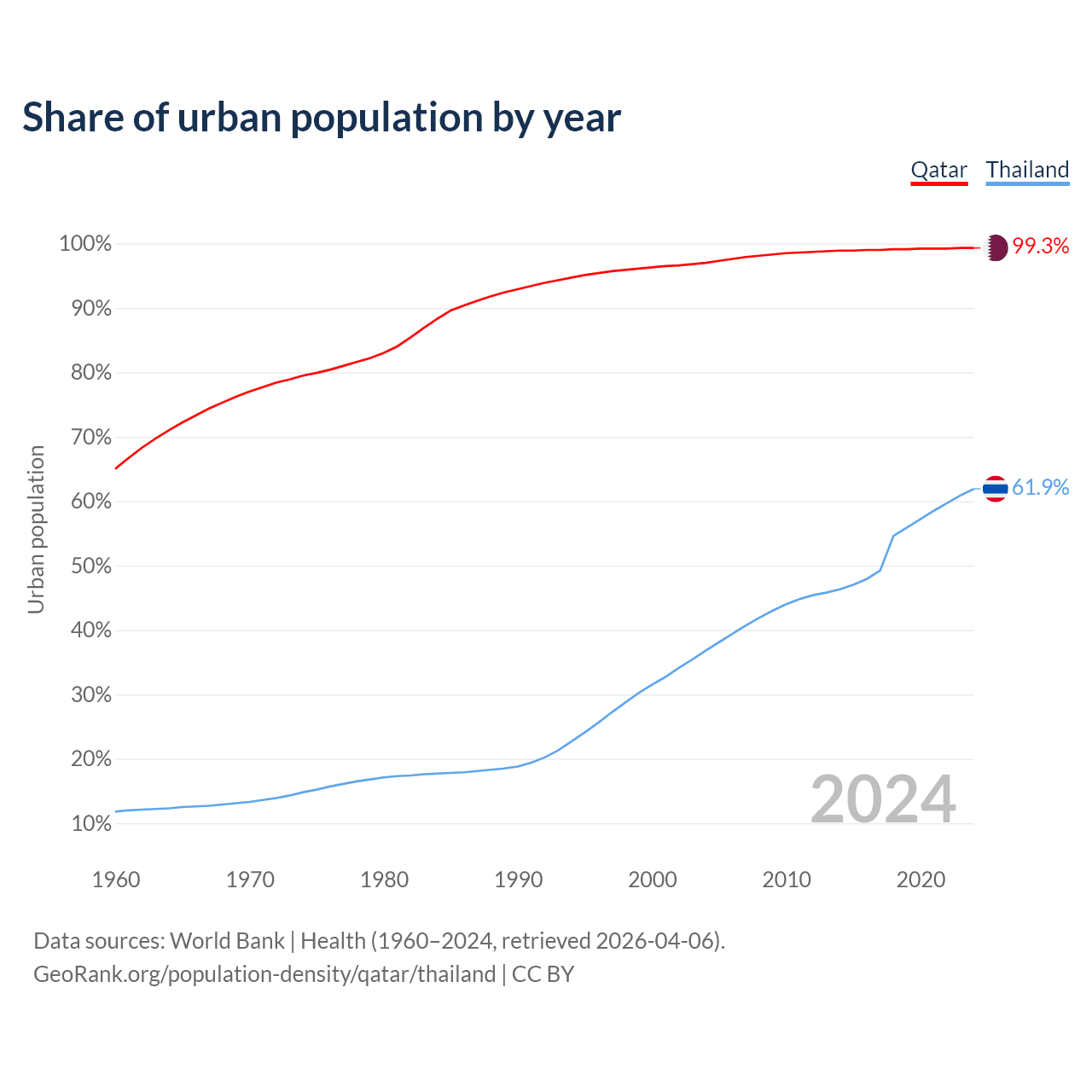 From 2004 to 2024, the share of urban population changed from 97% to 99.3% in Qatar and from 36.8% to 61.9% in Thailand.