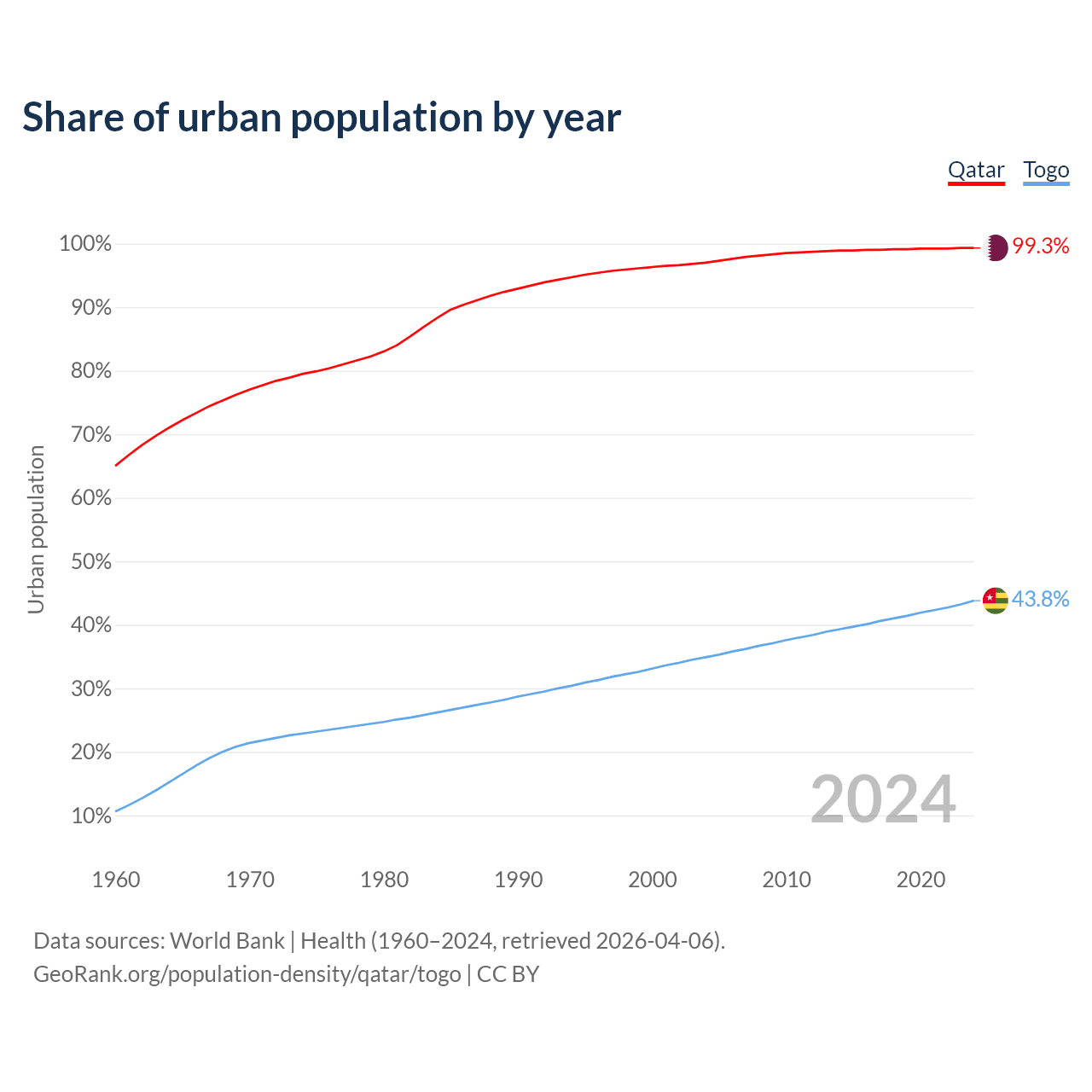 From 2004 to 2024, the share of urban population changed from 97% to 99.3% in Qatar and from 34.9% to 43.8% in Togo.