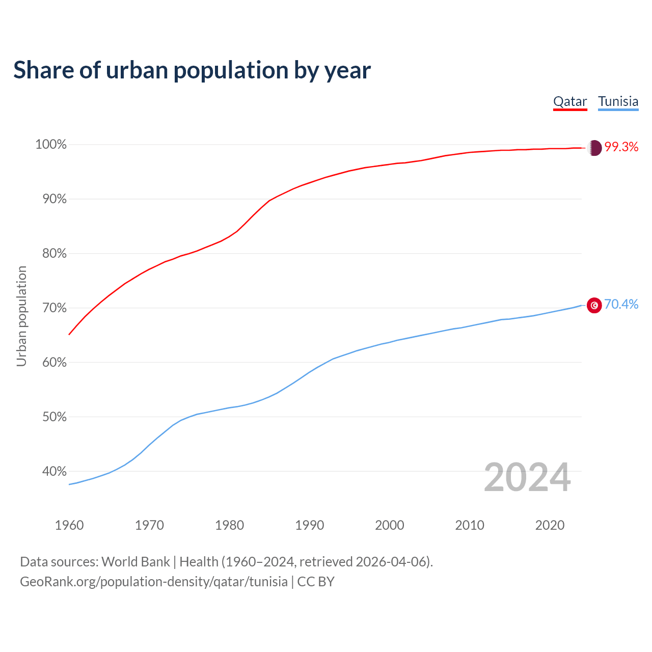 From 2004 to 2024, the share of urban population changed from 97% to 99.3% in Qatar and from 64.9% to 70.4% in Tunisia.