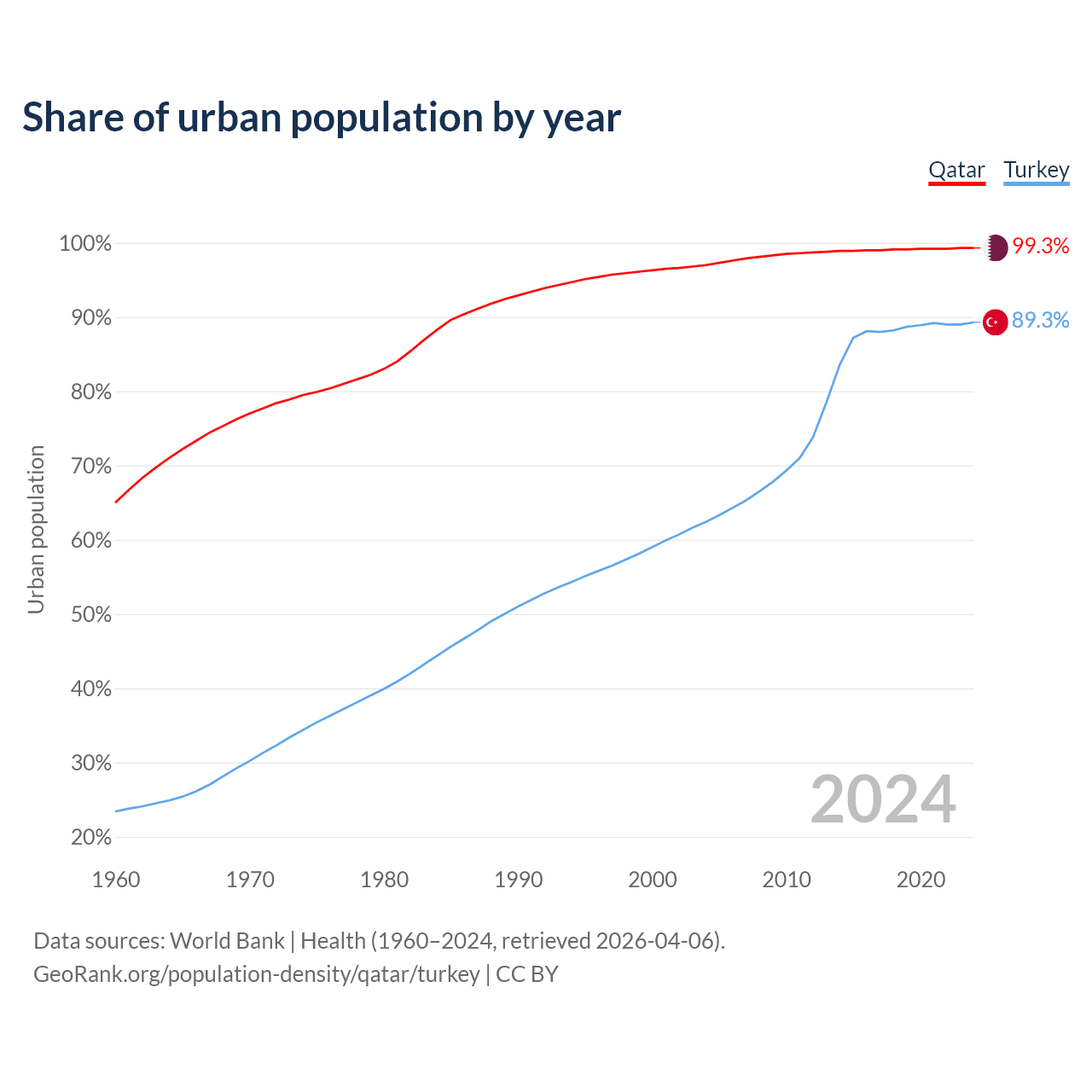 From 2004 to 2024, the share of urban population changed from 97% to 99.3% in Qatar and from 62.4% to 89.3% in Turkey.