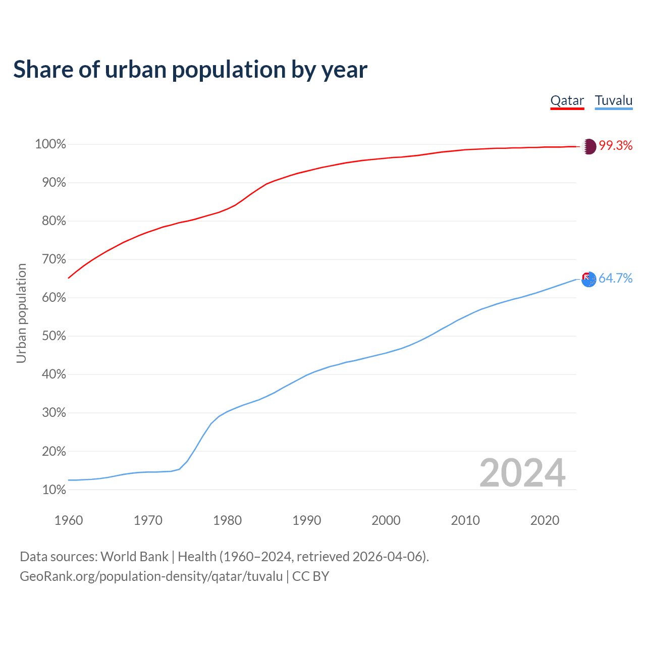 From 2004 to 2024, the share of urban population changed from 97% to 99.3% in Qatar and from 48.4% to 64.7% in Tuvalu.