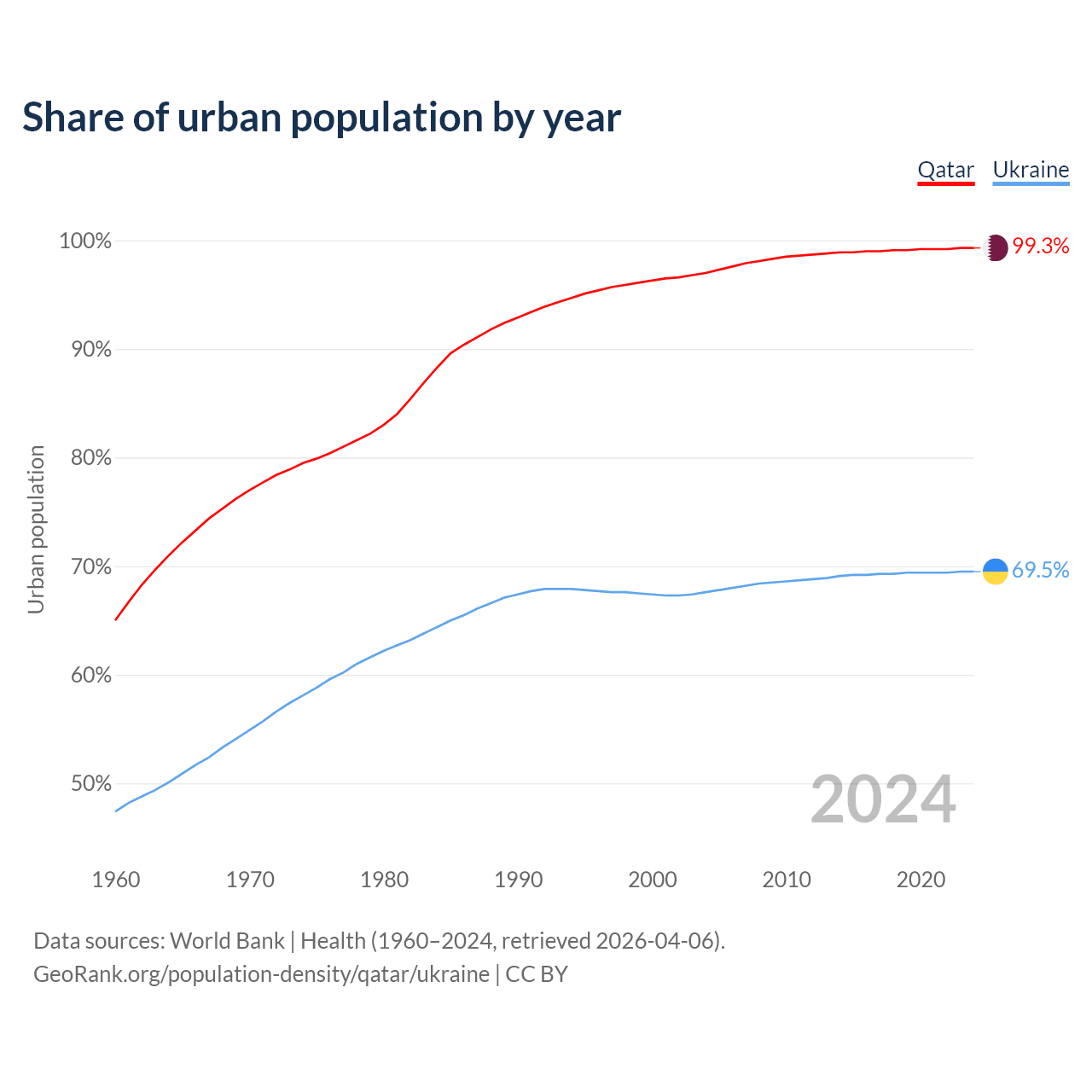 From 2004 to 2024, the share of urban population changed from 97% to 99.3% in Qatar and from 67.6% to 69.5% in Ukraine.