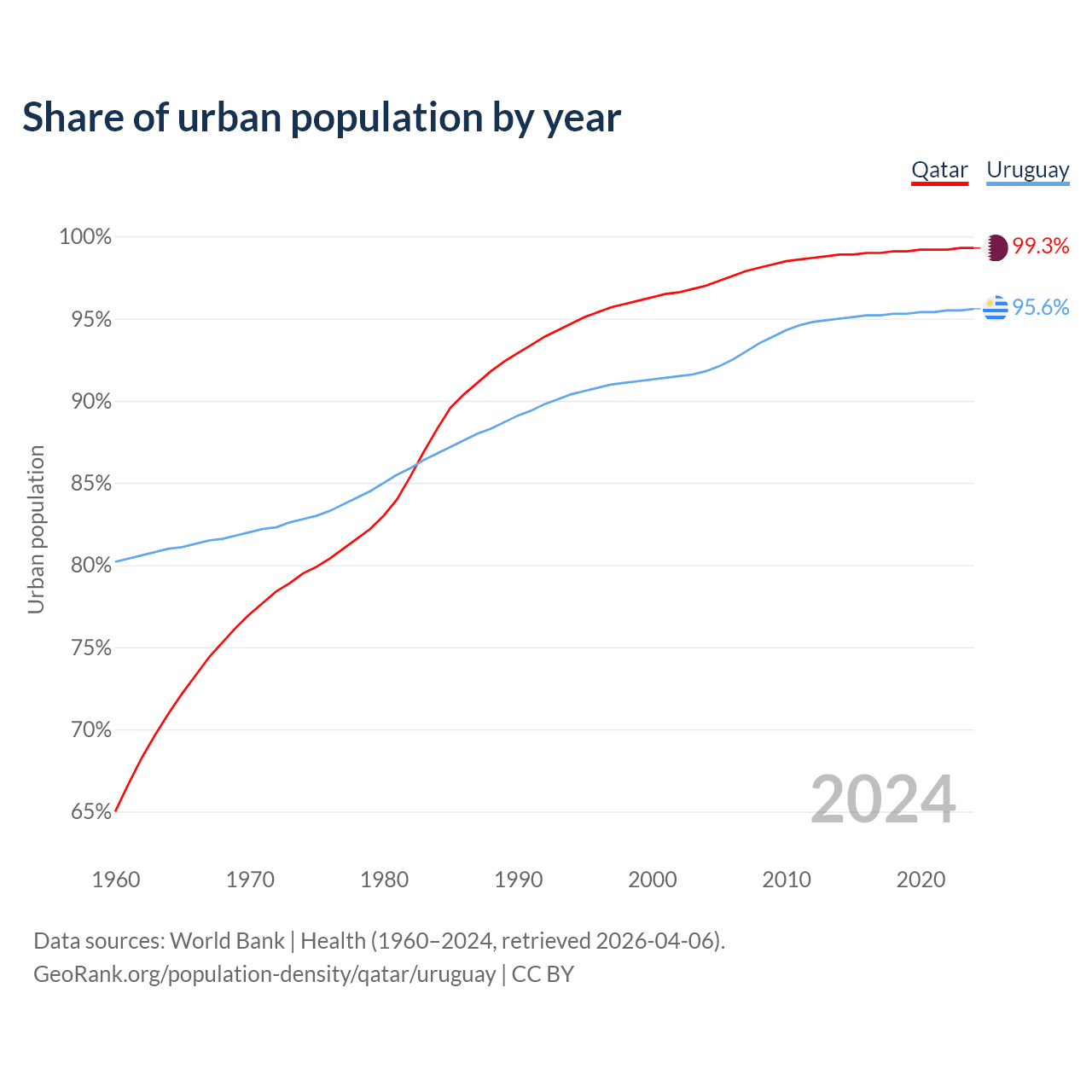 From 2004 to 2024, the share of urban population changed from 97% to 99.3% in Qatar and from 91.8% to 95.6% in Uruguay.