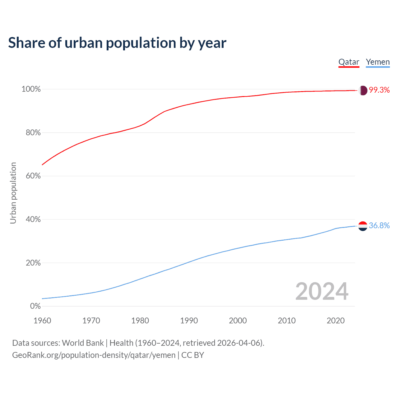 From 2006 to 2026, population density in Qatar increased by 210.1%, compared to a 82.6% growth in Yemen.