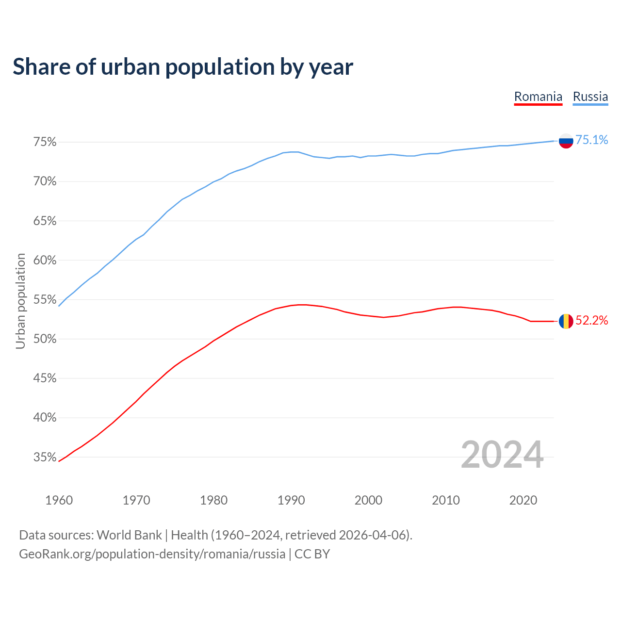 From 2004 to 2024, the share of urban population changed from 52.9% to 52.2% in Romania and from 73.3% to 75.1% in Russia.