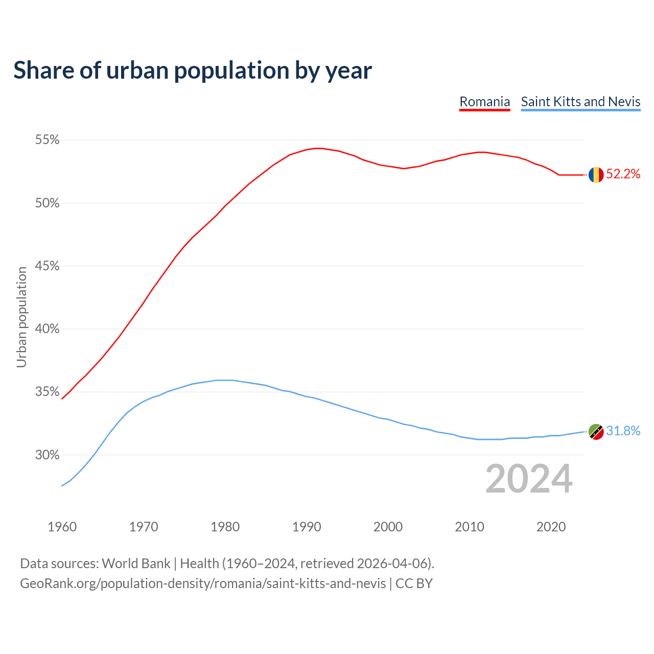 From 2004 to 2024, the share of urban population changed from 52.9% to 52.2% in Romania and from 32.1% to 31.8% in Saint Kitts and Nevis.