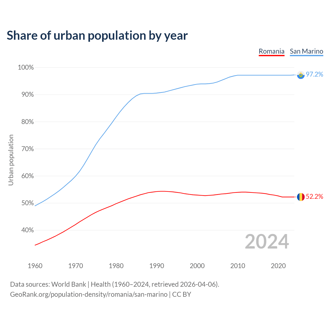 From 2004 to 2024, the share of urban population changed from 52.9% to 52.2% in Romania and from 94.2% to 97.2% in San Marino.