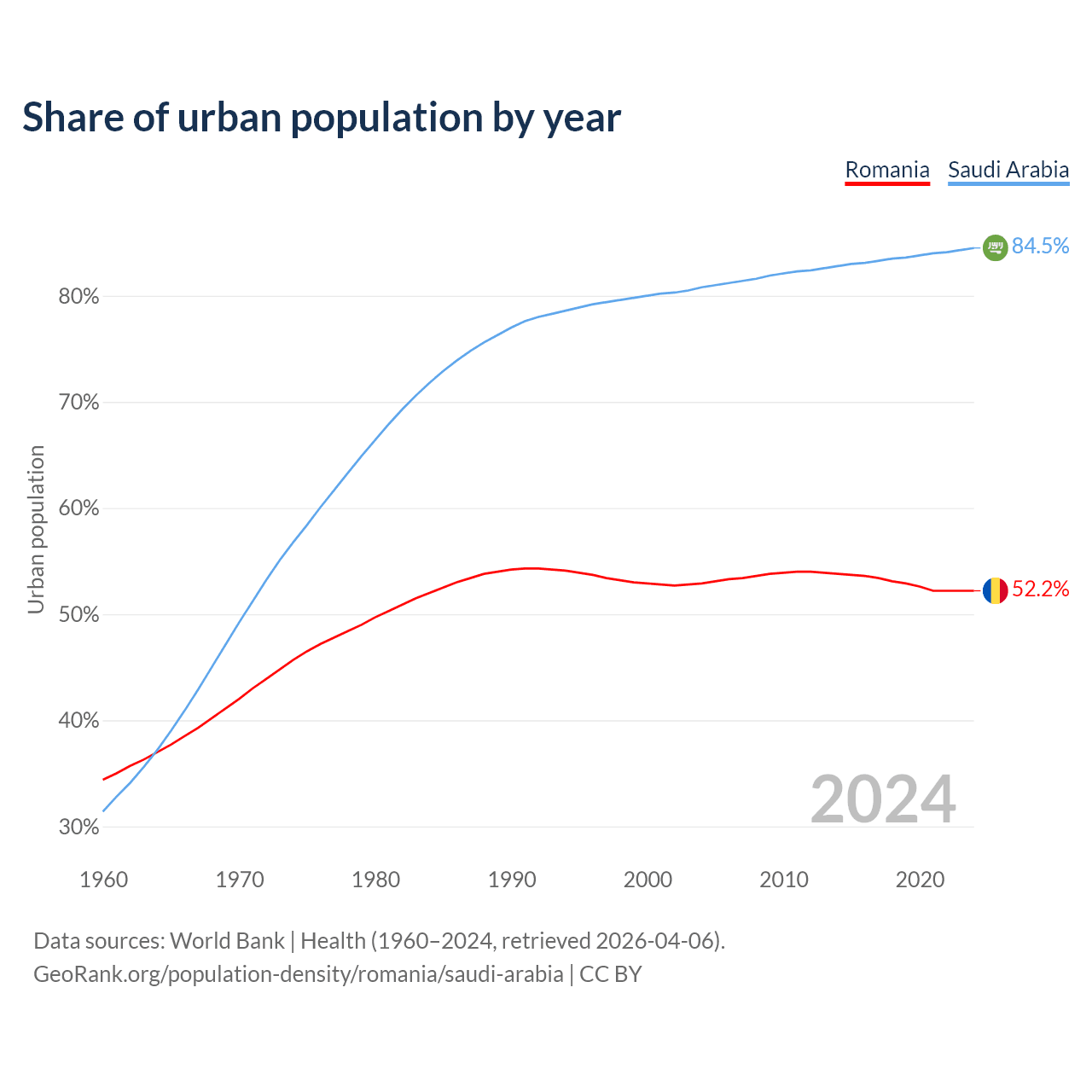 From 2004 to 2024, the share of urban population changed from 52.9% to 52.2% in Romania and from 80.8% to 84.5% in Saudi Arabia.
