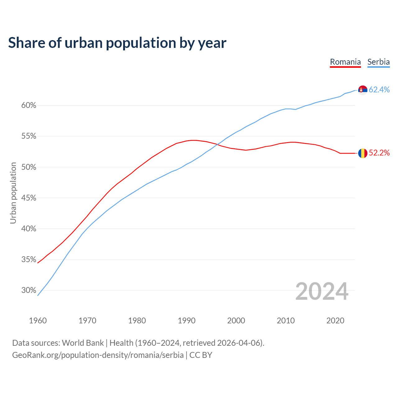From 2004 to 2024, the share of urban population changed from 52.9% to 52.2% in Romania and from 57.3% to 62.4% in Serbia.