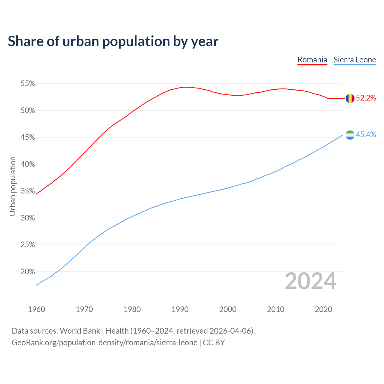 From 2004 to 2024, the share of urban population changed from 52.9% to 52.2% in Romania and from 36.5% to 45.4% in Sierra Leone.