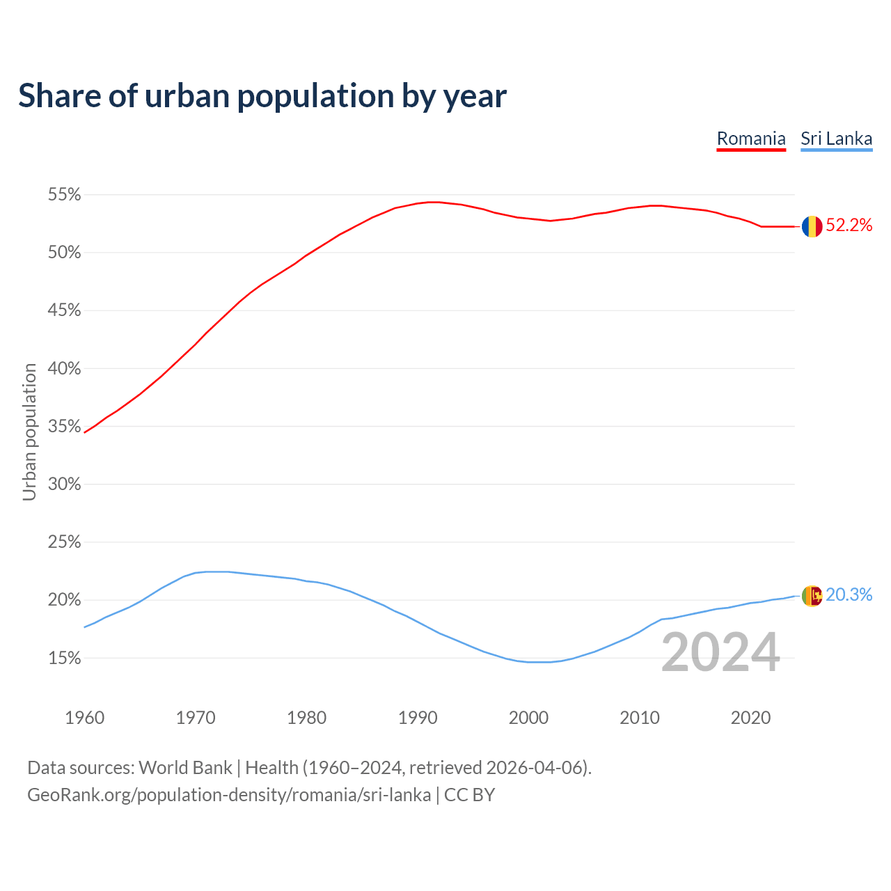 From 2004 to 2024, the share of urban population changed from 52.9% to 52.2% in Romania and from 14.9% to 20.3% in Sri Lanka.