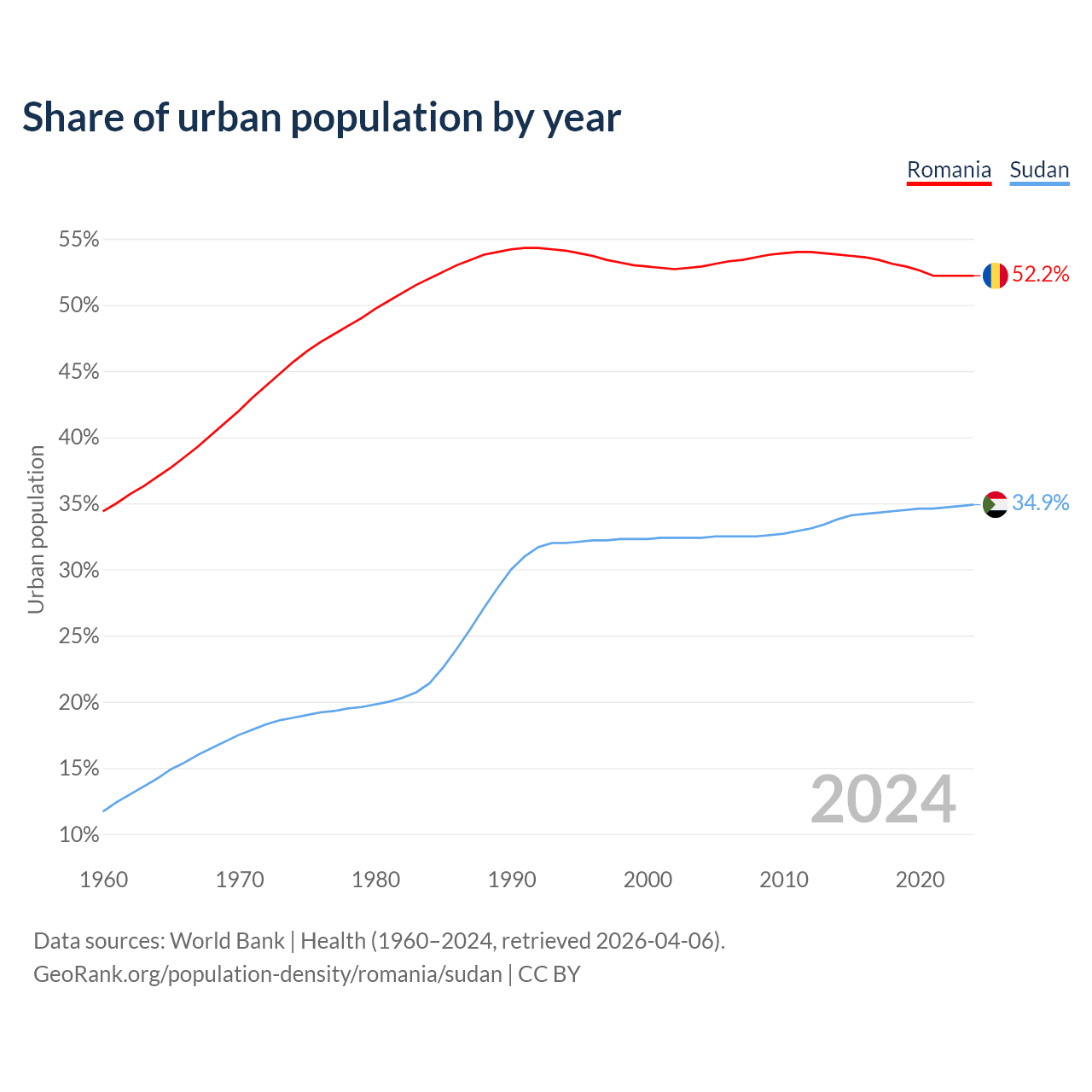 From 2004 to 2024, the share of urban population changed from 52.9% to 52.2% in Romania and from 32.4% to 34.9% in Sudan.