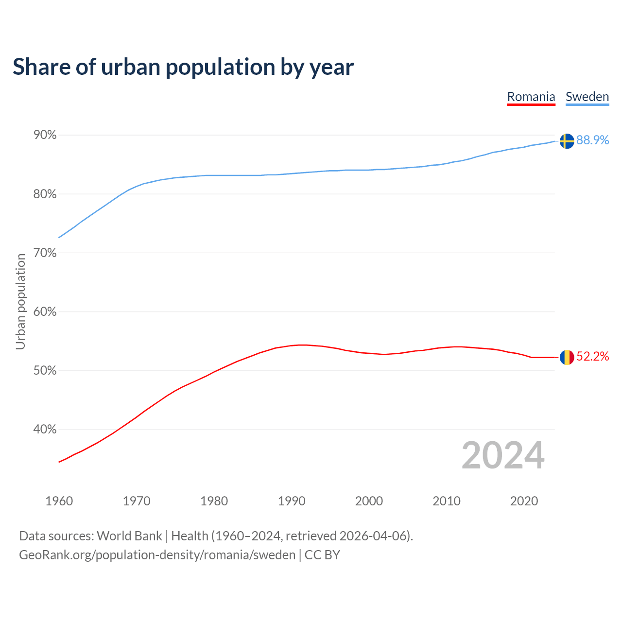 From 2004 to 2024, the share of urban population changed from 52.9% to 52.2% in Romania and from 84.3% to 88.9% in Sweden.