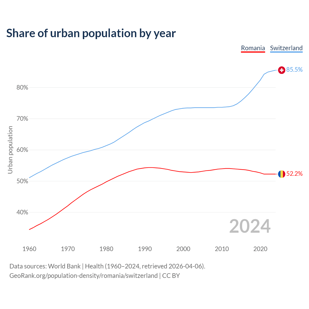 From 2004 to 2024, the share of urban population changed from 52.9% to 52.2% in Romania and from 73.5% to 85.5% in Switzerland.