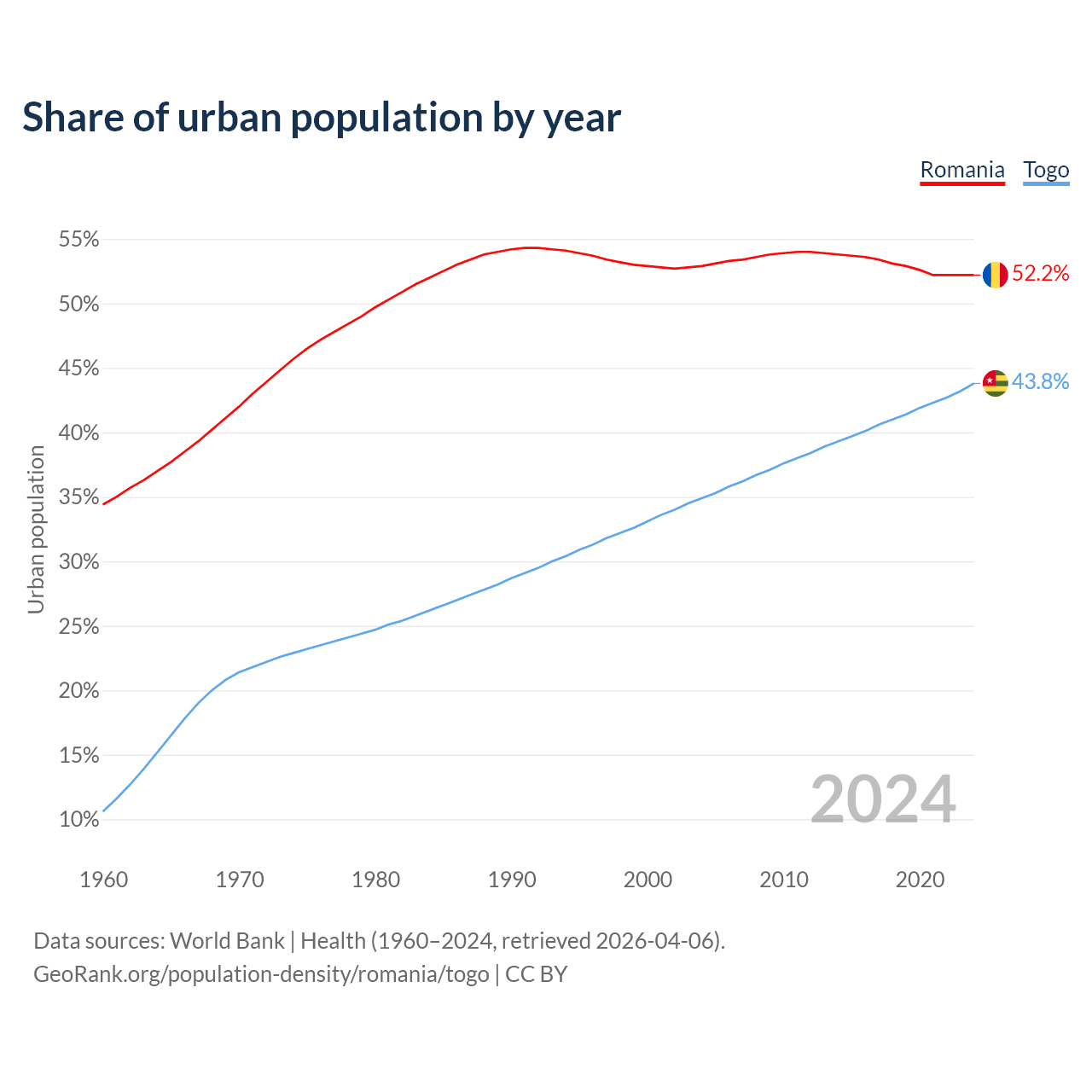 From 2004 to 2024, the share of urban population changed from 52.9% to 52.2% in Romania and from 34.9% to 43.8% in Togo.
