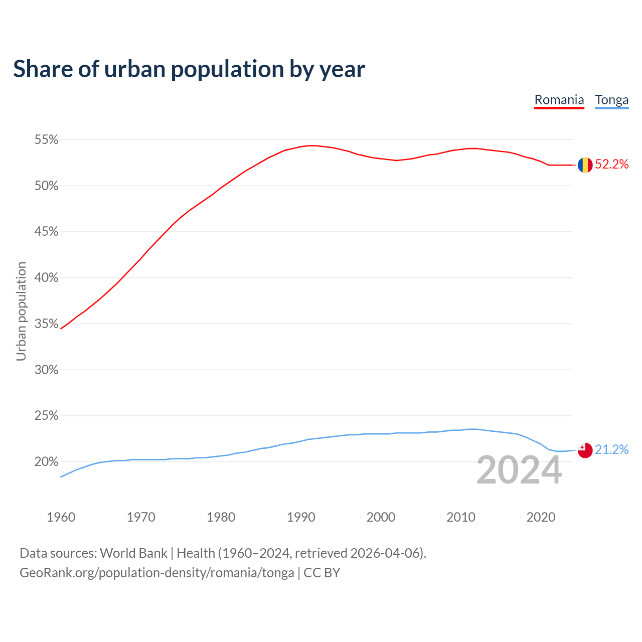From 2004 to 2024, the share of urban population changed from 52.9% to 52.2% in Romania and from 23.1% to 21.2% in Tonga.