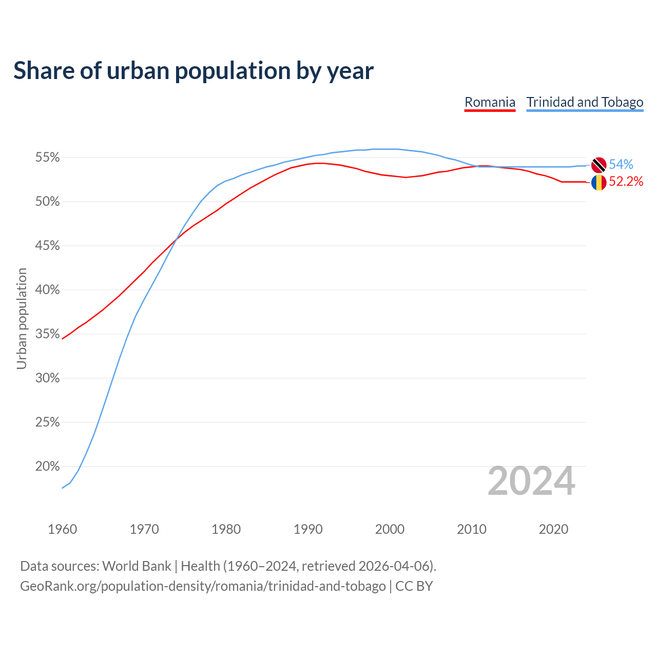 From 2004 to 2024, the share of urban population changed from 52.9% to 52.2% in Romania and from 55.6% to 54% in Trinidad and Tobago.