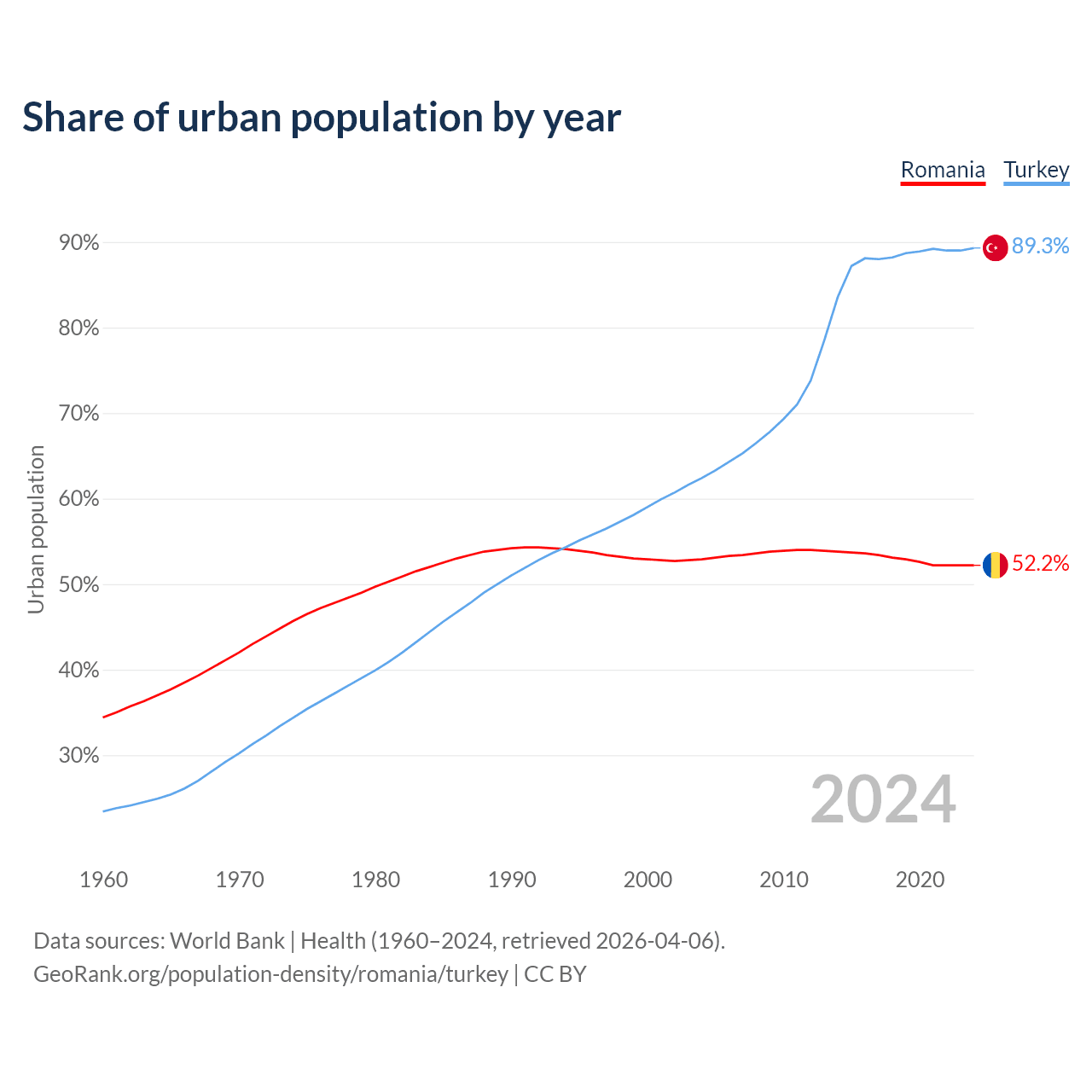From 2004 to 2024, the share of urban population changed from 52.9% to 52.2% in Romania and from 62.4% to 89.3% in Turkey.