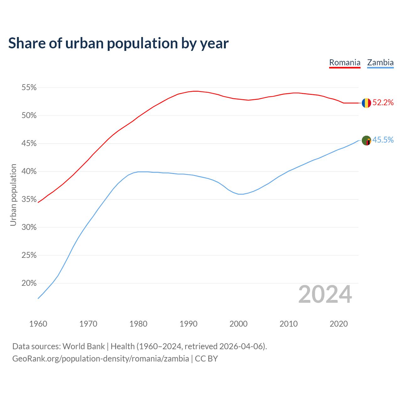From 2004 to 2024, the share of urban population changed from 52.9% to 52.2% in Romania and from 36.8% to 45.5% in Zambia.