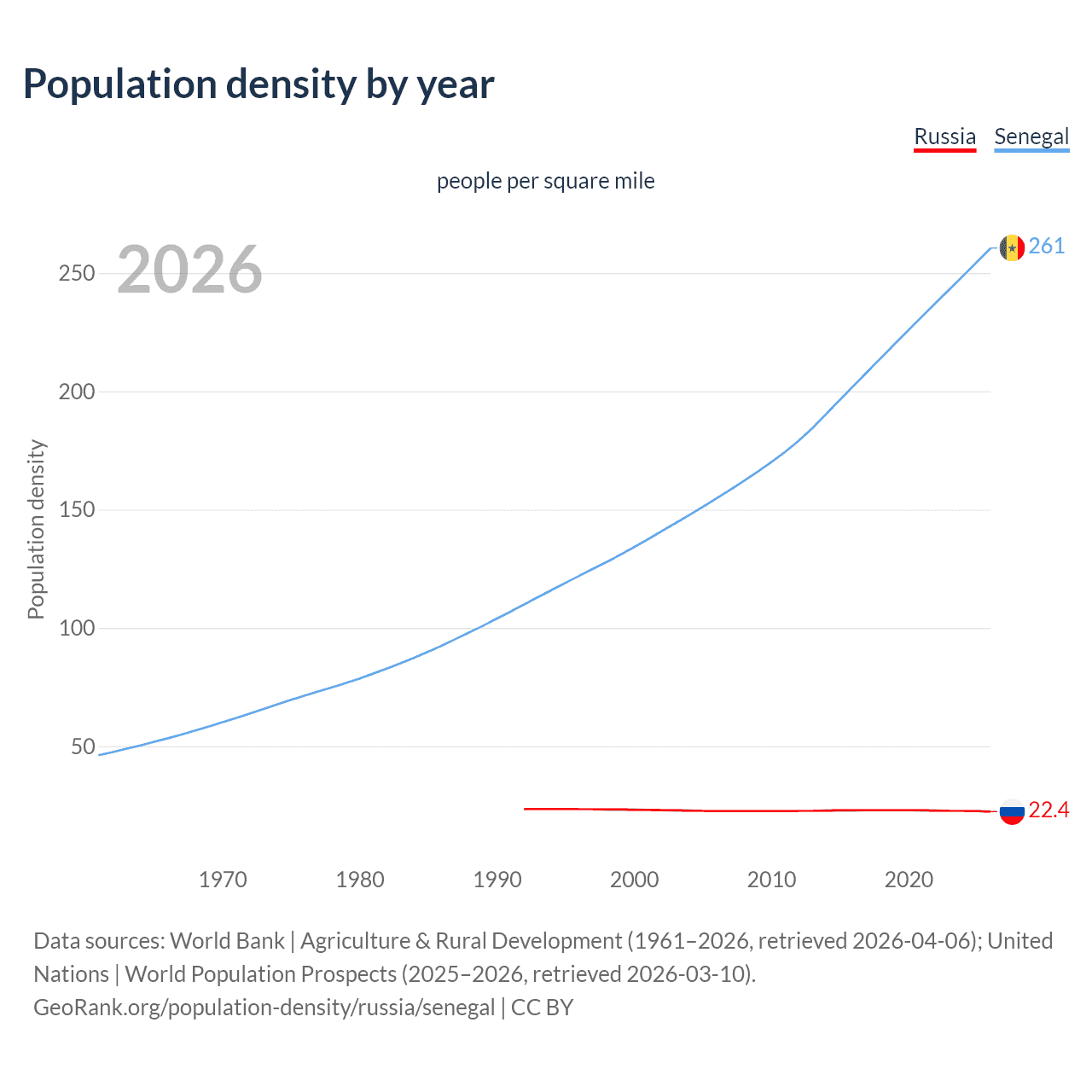 From 2006 to 2026, population density in Russia decreased by 0.79%, compared to a 68.5% growth in Senegal.