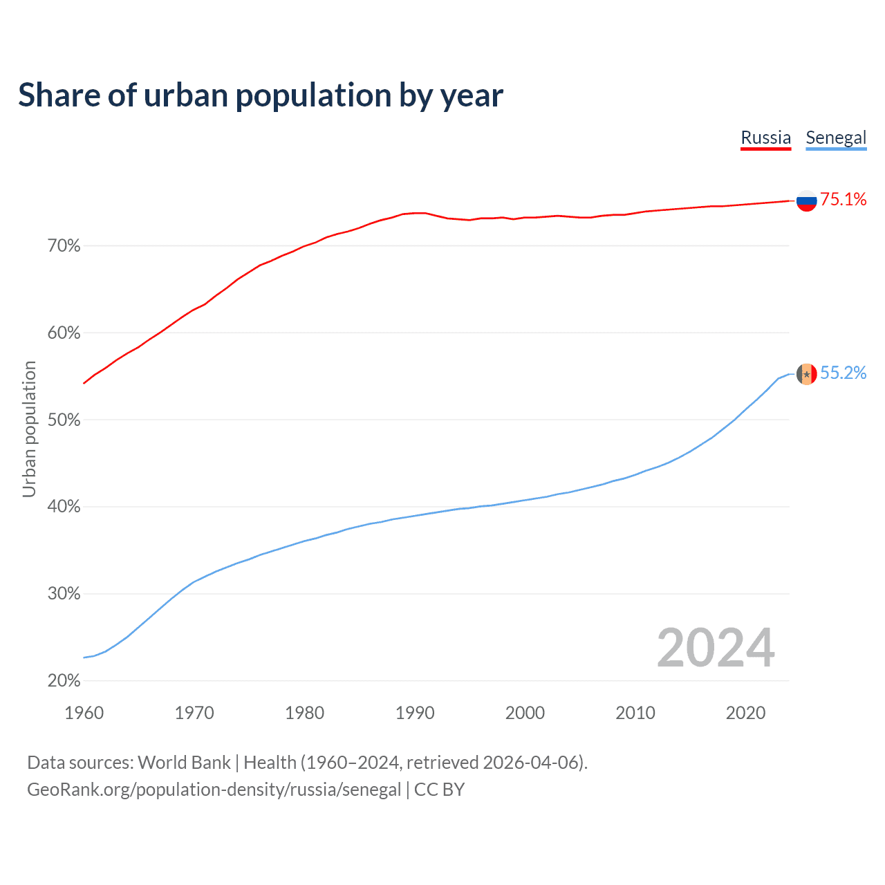 From 2004 to 2024, the share of urban population changed from 73.3% to 75.1% in Russia and from 41.6% to 55.2% in Senegal.