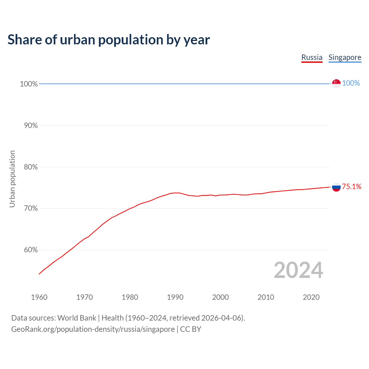 From 2004 to 2024, the share of urban population changed from 73.3% to 75.1% in Russia and from 100% to 100% in Singapore.