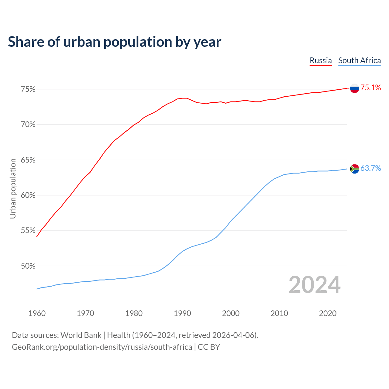 From 2004 to 2024, the share of urban population changed from 73.3% to 75.1% in Russia and from 59.1% to 63.7% in South Africa.