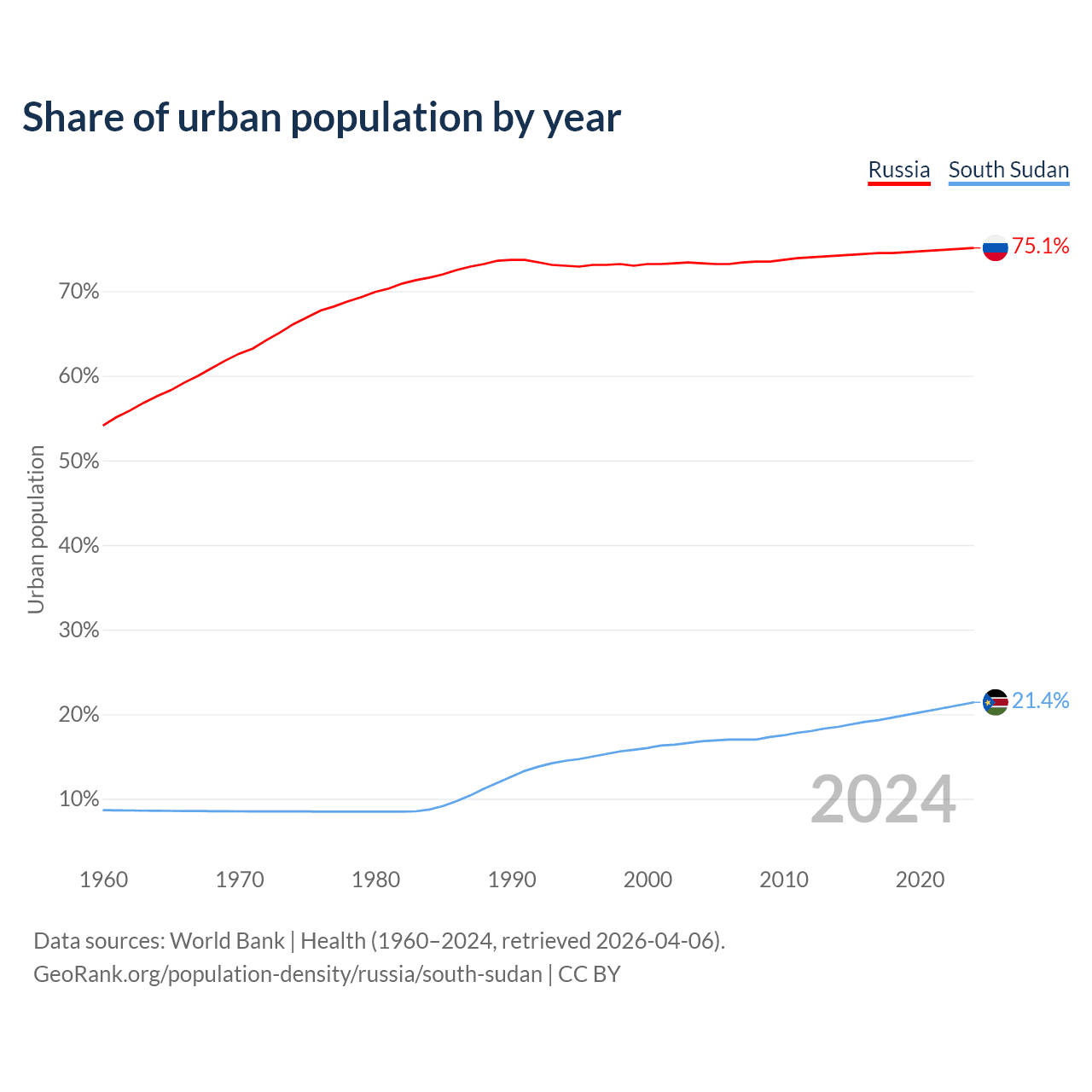 From 2004 to 2024, the share of urban population changed from 73.3% to 75.1% in Russia and from 16.8% to 21.4% in South Sudan.
