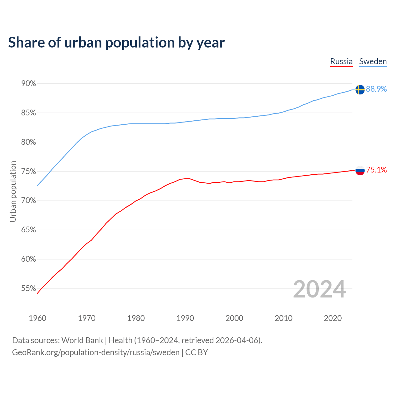 From 2004 to 2024, the share of urban population changed from 73.3% to 75.1% in Russia and from 84.3% to 88.9% in Sweden.