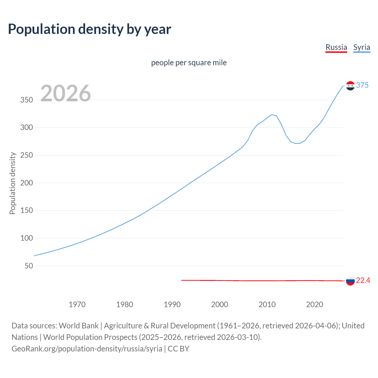 From 2006 to 2026, population density in Russia decreased by 0.79%, compared to a 35.5% growth in Syria.
