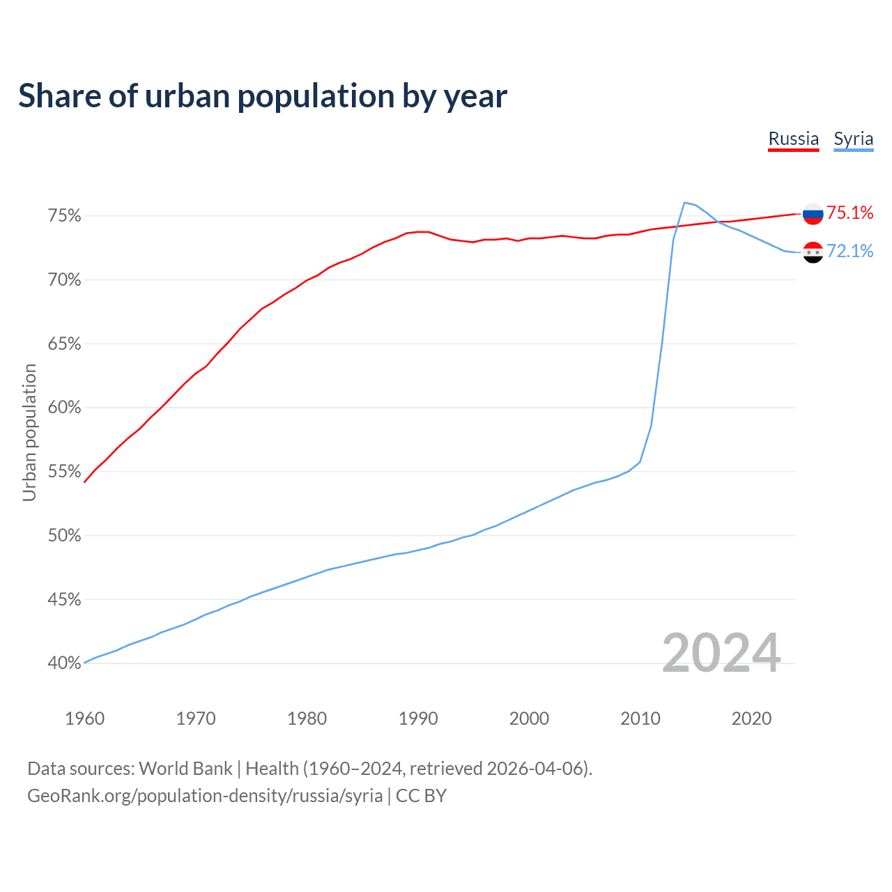 From 2004 to 2024, the share of urban population changed from 73.3% to 75.1% in Russia and from 53.5% to 72.1% in Syria.