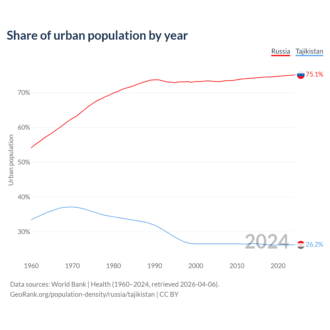 From 2004 to 2024, the share of urban population changed from 73.3% to 75.1% in Russia and from 26.5% to 26.2% in Tajikistan.
