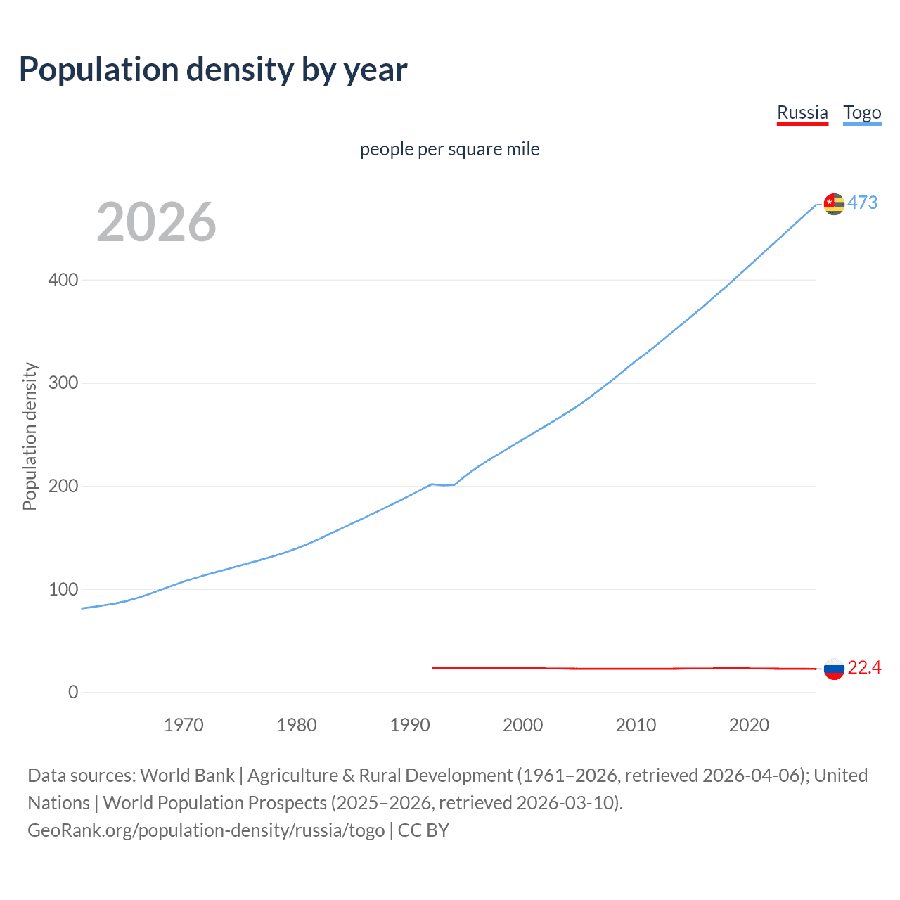 Russia has a population density of 22.4 people per square mile compared to 473 people in Togo. Russia has 1,280,521 sq ft of land per person vs 64,237 sq ft in Togo. Russia and Togo rank 186th and 57th by population density, respectively.
