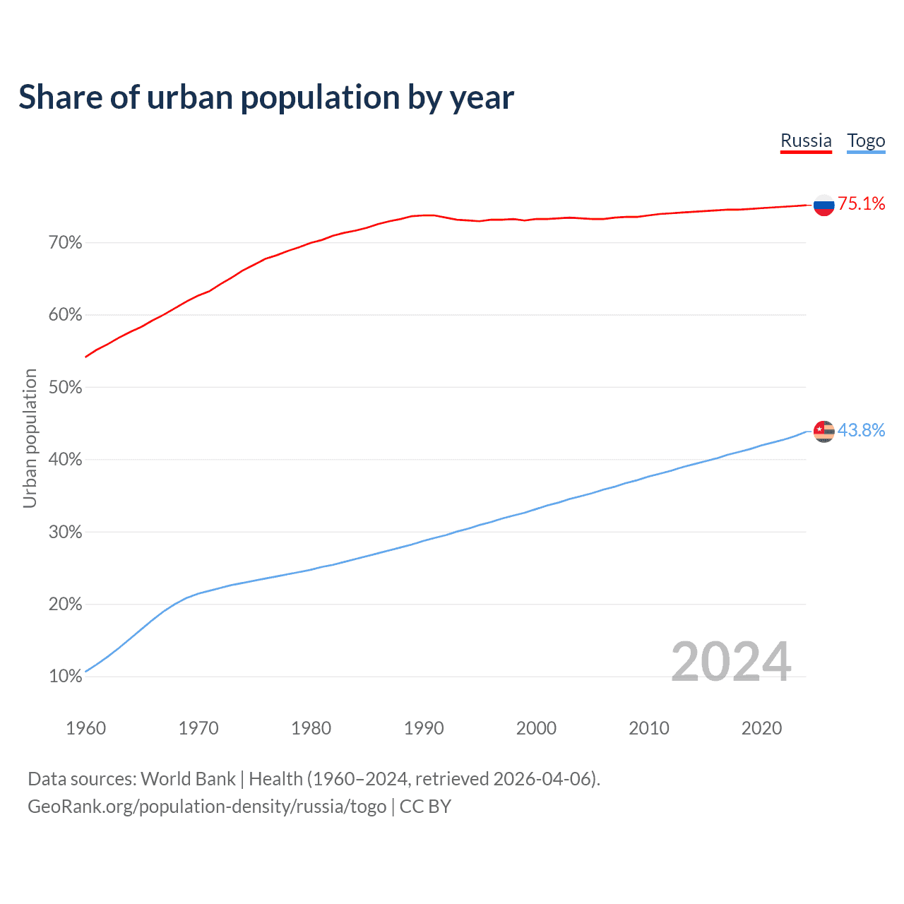 From 2004 to 2024, the share of urban population changed from 73.3% to 75.1% in Russia and from 34.9% to 43.8% in Togo.