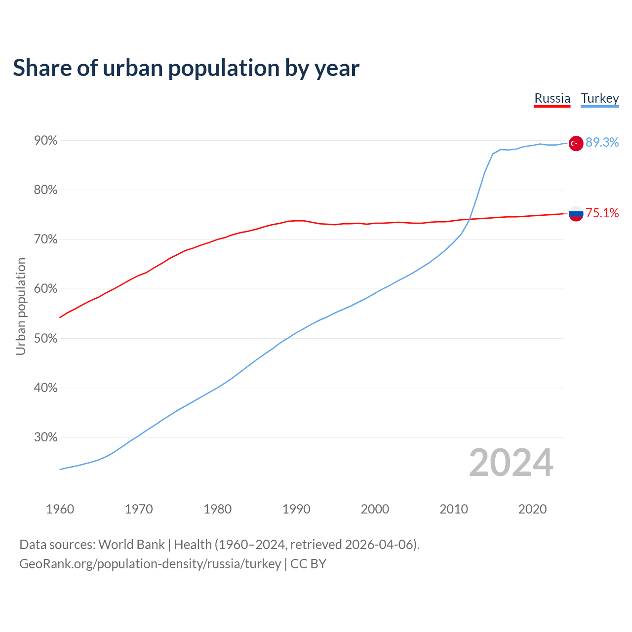 From 2004 to 2024, the share of urban population changed from 73.3% to 75.1% in Russia and from 62.4% to 89.3% in Turkey.