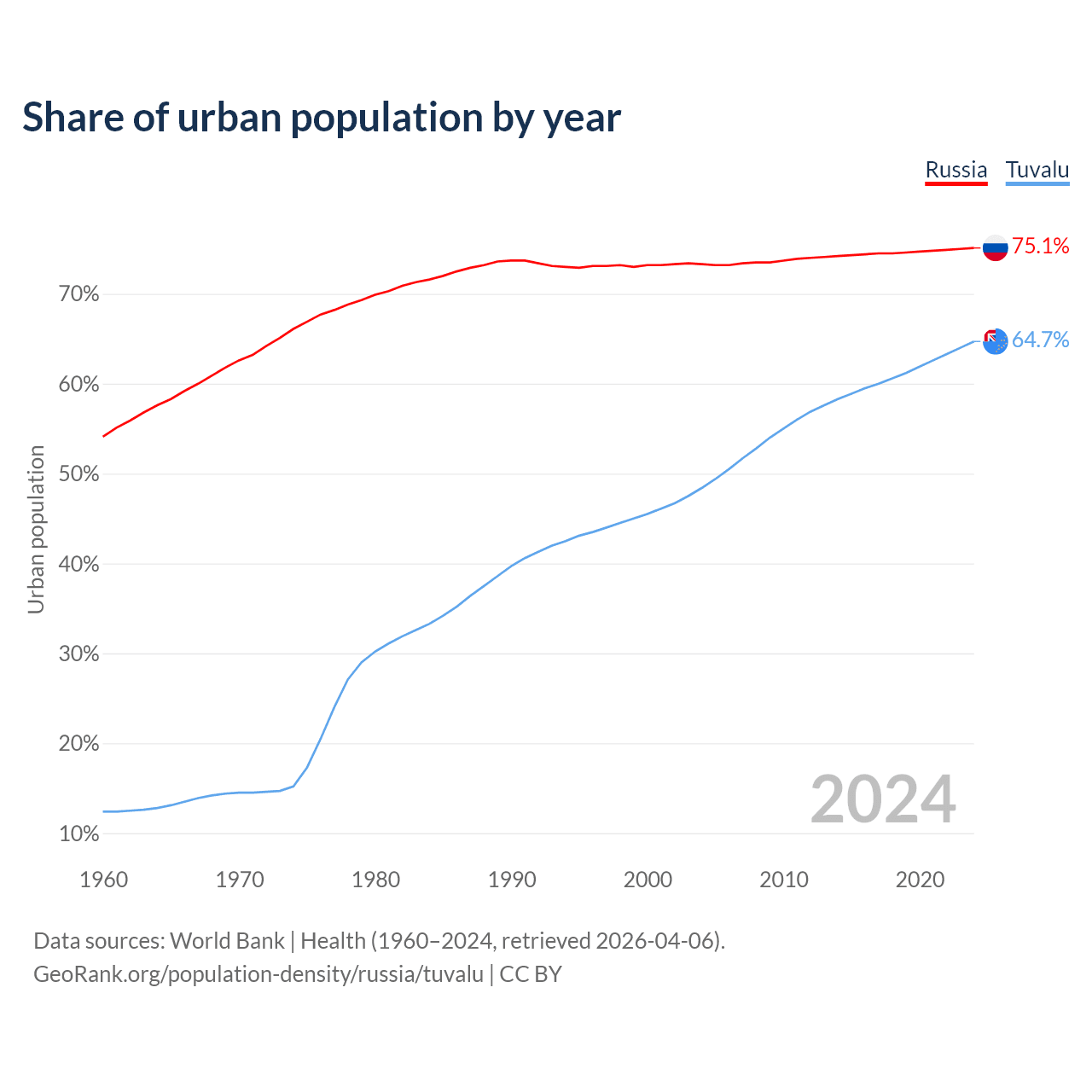 From 2004 to 2024, the share of urban population changed from 73.3% to 75.1% in Russia and from 48.4% to 64.7% in Tuvalu.